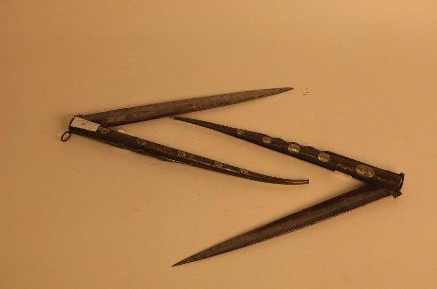 Manches recouverts de laiton, à pastilles en métal blanc décoré de visages, personnages.