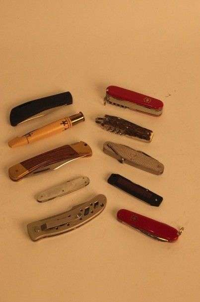 Lot de 10 couteaux pliants, à lames simples et multiples.