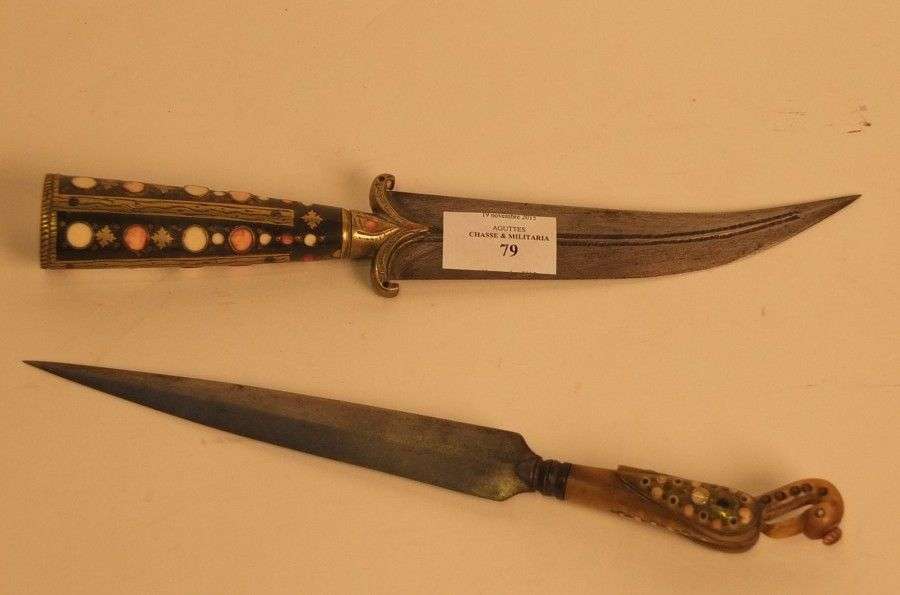 Manches en corne décoré d'incrustations de pierres dures et de motifs en laiton.