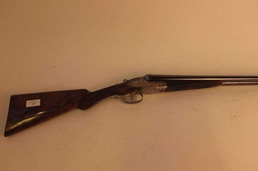 Canons juxtaposés de 71 cm. Bascule et faux-corps ciselés de cerfs, chiens, oiseaux, fleurs et feuillages. Double détentes dorées.