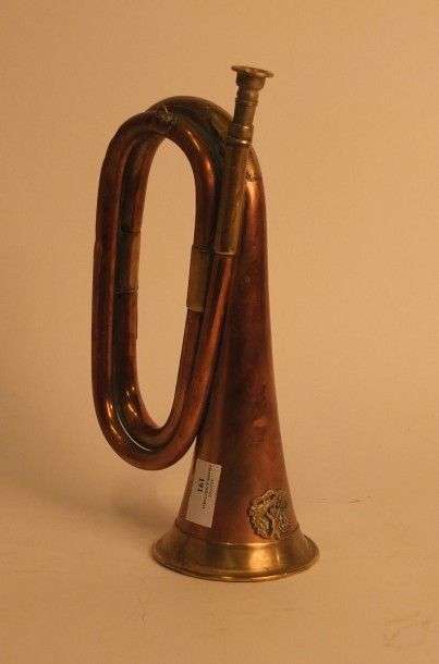 Bugle, en cuivre et laiton, avec insigne rapporté et postérieur. BE