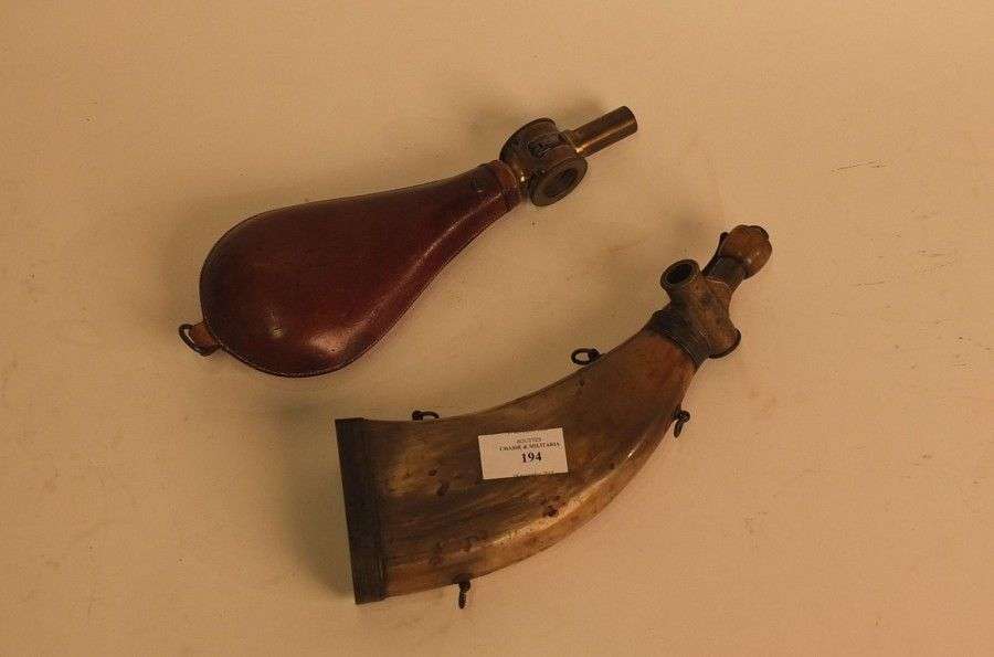 Lot: poire à poudre en corne| poire à plombs, en cuir.