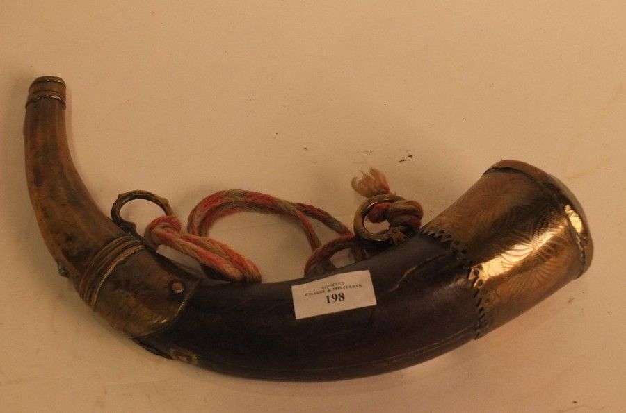 Corne à poudre, en corne, à garnitures en laiton, découpé, décoré.