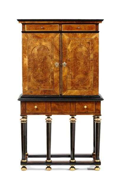 Cabinet en placage de bois de ronce à décor de filets de bois foncé et bois clair.Il ouvre à deux tiroirs en partie haute et deux portes découvrant un magnifique intérieur à décor architecturé à douze tiroirs et une porte, le tout orné de plaques en pietra paesine. Petit théâtre marqueté d'os et à décor de miroirs et d'un trompe l'oeil. Garniture de bronze patiné à décor de coquilles.