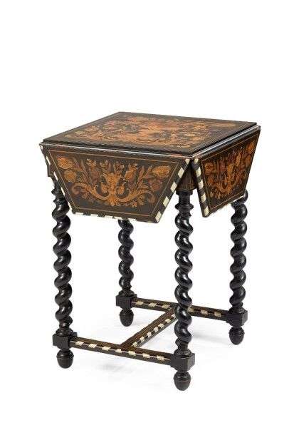 Table à quatre volets en ébène et marqueterie d'ivoire à décor d'un bouquet fleuri dans un encadrement de filet à bâtons rompus.