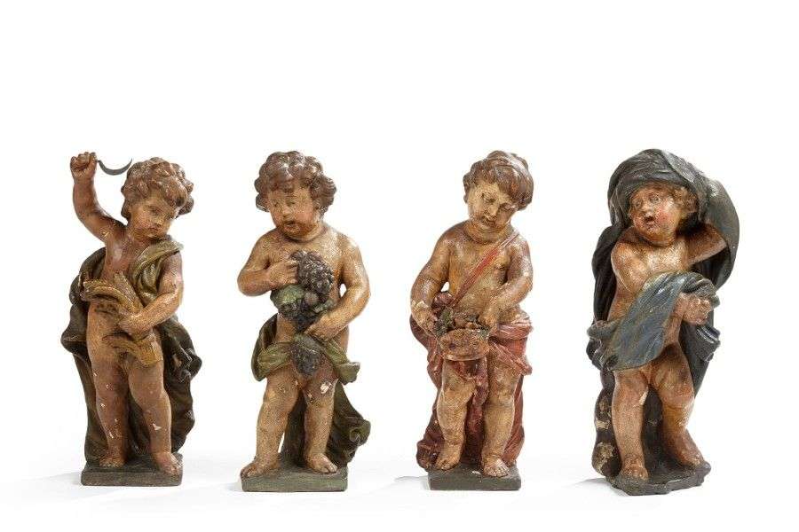 Quatre sujets en terre cuite représentant des putti arborant les attributs des saisons