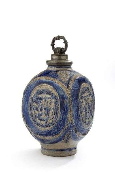 Bouteille de forme quadrangulaire en grès à glaçure bleue dans le goût de Raeren, à décor d'armoiries ecclesiastiques et inscrptions. Bouchon en étain.