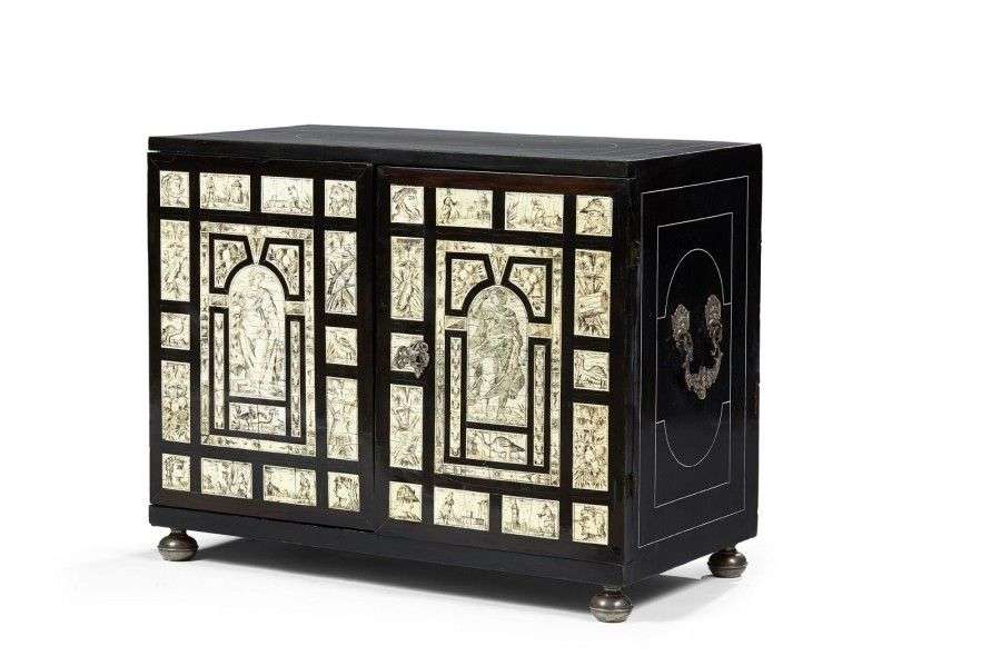Petit cabinet en placage d'ébene à décor architecturé de plaques d'ivoire gravé de scènes champêtres, attributs et personnages vêtus à l'antique. Il ouvre à deux portes et présente un intérieur structuré en trois parties à quatre tiroir latéraux et une petite porte centrale dissimulée. Il est orné de deux poignées de transport et repose sur quatre pieds boules.
