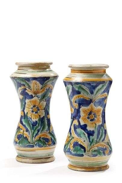 Paire d'albarelli en faïence à décor polychrome de rinceaux