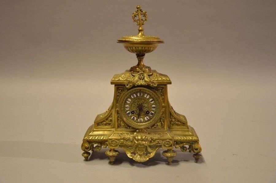Pendule borne en bronze doré à décor de volutes et mascarons. Cadran en cu