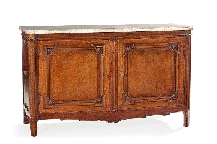 Important buffet en noyer mouluré. Il ouvre à deux portes à décor sculpté en reserves. Montants à pans coupés cannelés. Traverse droite.