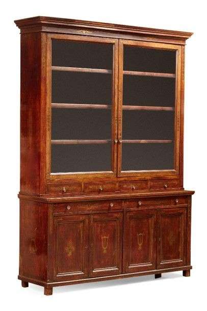 Bibliotèque en acajou flammée. La partie supérieure vitrée ouvrant à deux vantaux surmontés de quatre petits tiroirs, la partie basse ouvrant à quatre vantaux surmontés de deux tiroirs.