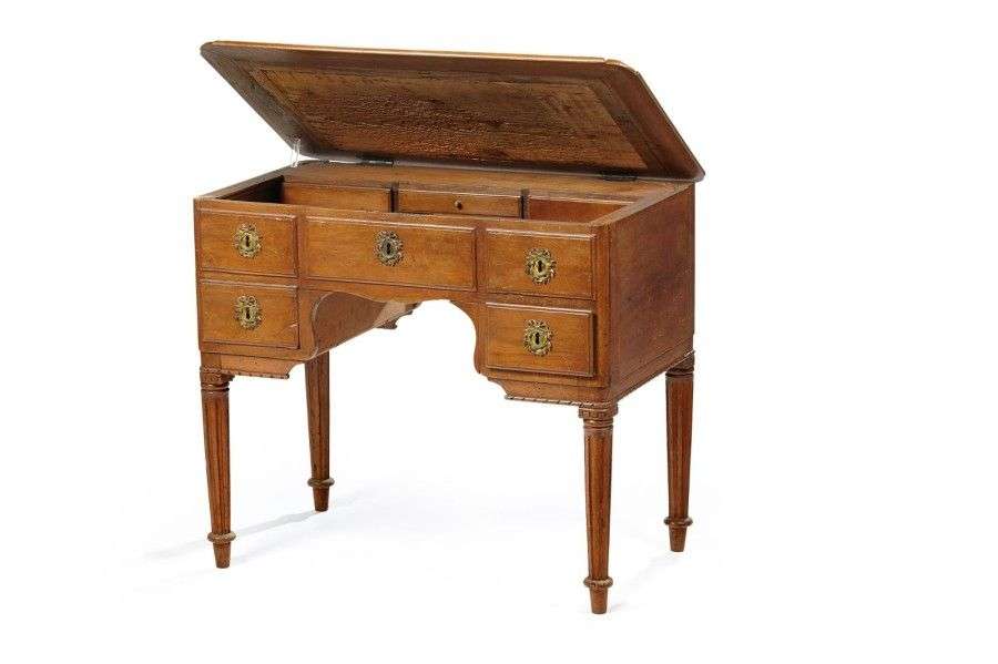 Charmant petit bureau de dame en bois naturel ouvrant à cinq tiroirs en ceinture. Plateau garni de maroquin camel doré au petit fer. Pieds fuselés et cannelés.