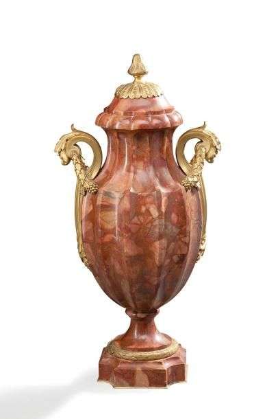 Vase couvert en albâtre rouge. Anses et monture en bronze doré à décor de