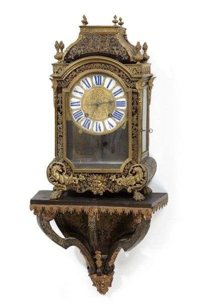 Cartel en marqueterie d'écaille et de laiton de style Boulle à décor à la Berain de lambrequins, putti et petits animaux. Garniture de bronzes dorés de pots à feu, coquilles, chevaux fantastique et mascaron. Il repose sur quatre pieds griffes. Cadran en cuivre ciselé à chiffres romains dans des cartouches émaillés.