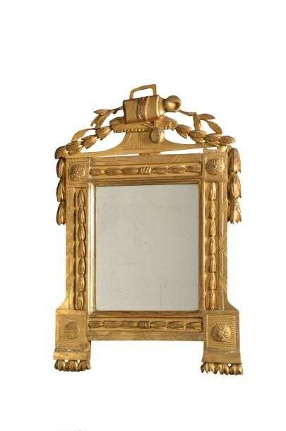 Petit miroir en bois doré surmonté d'un trophée orné d'un arrosoir dans une guirlande de feuilles