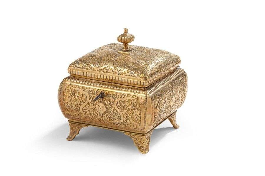 Coffret à bijoux en bronze doré à décor finement de volutes et motifs floraux ciselé. Repose sur quatre petits pieds. Signé F. Barbedienne