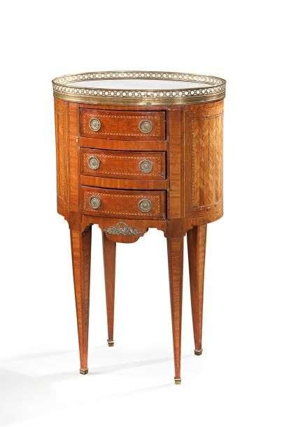 Table de salon ovale en placage de bois de rose et marqueterie en damier dans des encadrements de filets à bâtons rompus. Elle ouvre à trois tiroirs en façade.