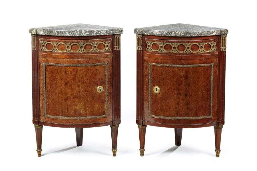 Paire d'encoignures en acajou et placage d'acajou ouvrant à une porte.Montants plats cannelés, pieds fuselés et cannelés. Frises d'entrelacs en bronze doré.