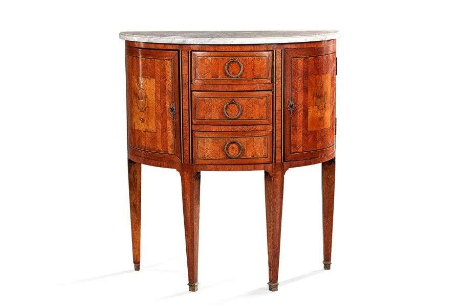 Commode demi lune en bois de placage marqueté en chevron dans des encadrem