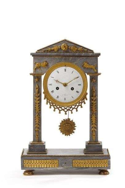 Pendule portique en marbre gris et ornementation de bronze doré