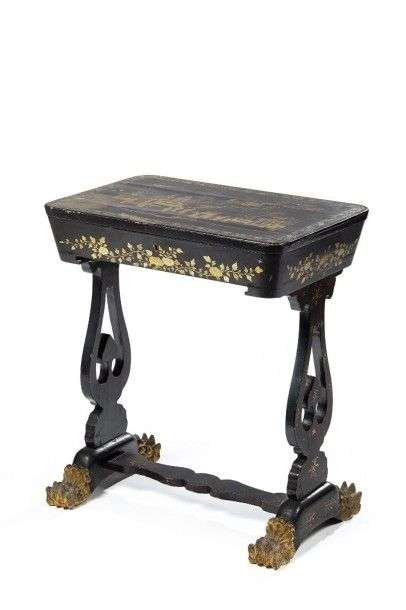 Travailleuse en bois laqué noir à décor doré de chinoiseries.Ouverture à abattant laissant découvrir un intérieur à divers compartiments contenant des outils de couture en ivoire. Piétement lyre relié par une entretoise et pieds pattes de lions.