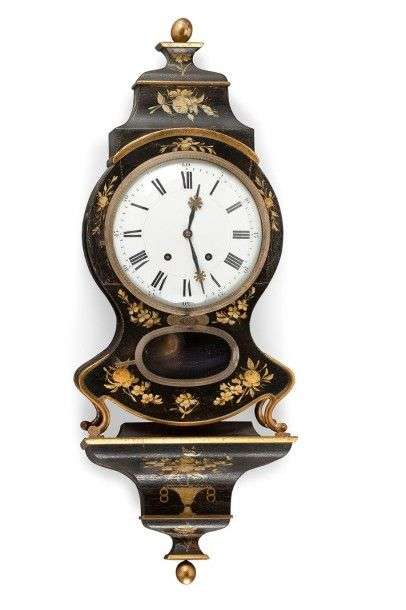 Neuchateloise et sa console en bois noirci à décor peint de fleurs. Cadran émaillé blanc à chiffres romains.