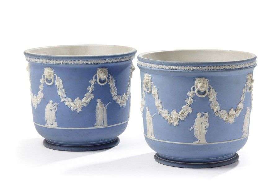 Paire de rafraichissoirs en biscuit de Wedgwood à décor néoclassique sur fond bleu