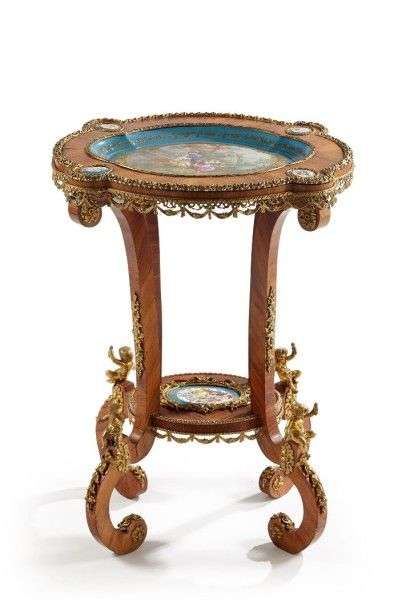 Il est orné au centre d'un plat en porcelaine bleue de Sèvres à décor or de fleurettes, de feuillages, de fleurs, d'un paysage lacustre avec une scène galante dans le goût de Boucher et de médaillons avec des bouquets de fleurs dans les angles.