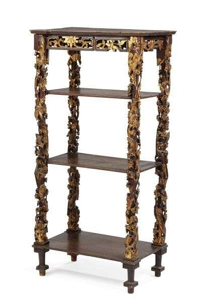 Petit meuble formant bibliothèque à quatre plateaux. Montants et traverses à décor ajouré d'oiseaux branchés.