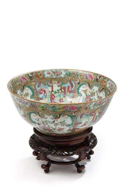 Importante coupe en porcelaine de Canton à décor de scènes de palais et motifs floraux