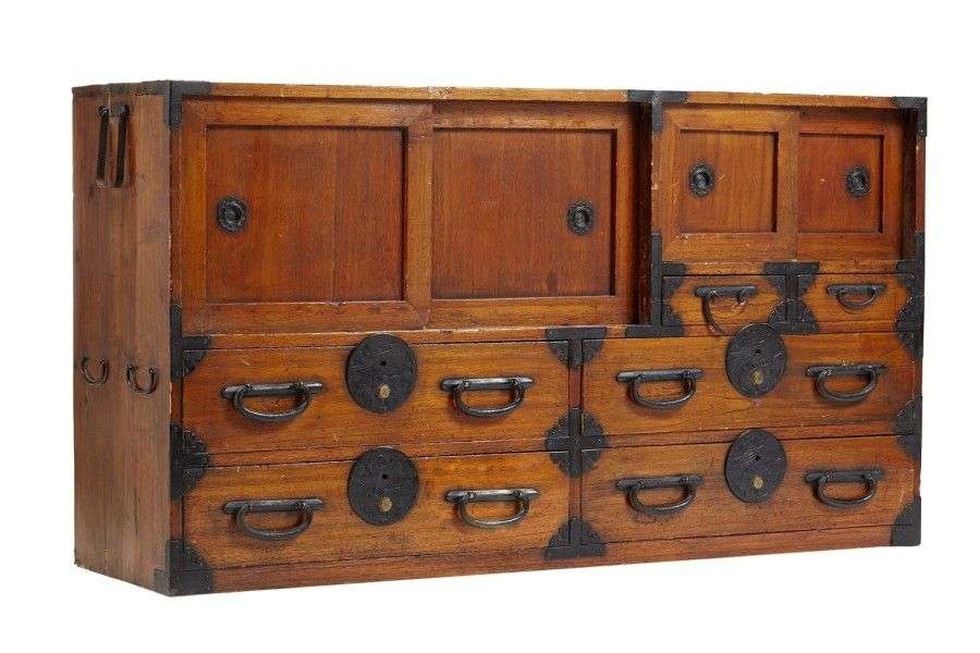 Commode dite «Tansu» en bois de résineux, ornementation de fer gravé de motifs végétaux et noirci (entrée de serrure, poignée) de forme parallélépipédique, ouvrant par six tiroirs disposés sur trois rangs et deux vantaux coulissants. Six poignées de préhension latérales.