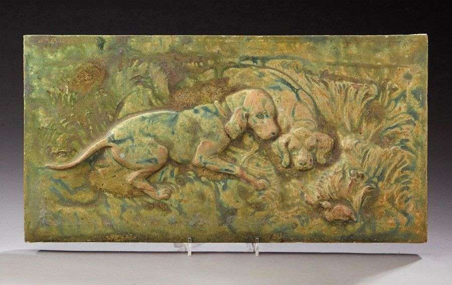 Plaque rectangulaire en grès émaillé vert nuancé à décor de deux chiens et d'un canard. Vers 1900. H: 27 cm L: 51,5 cm P: 2 cm (infimes éclats)