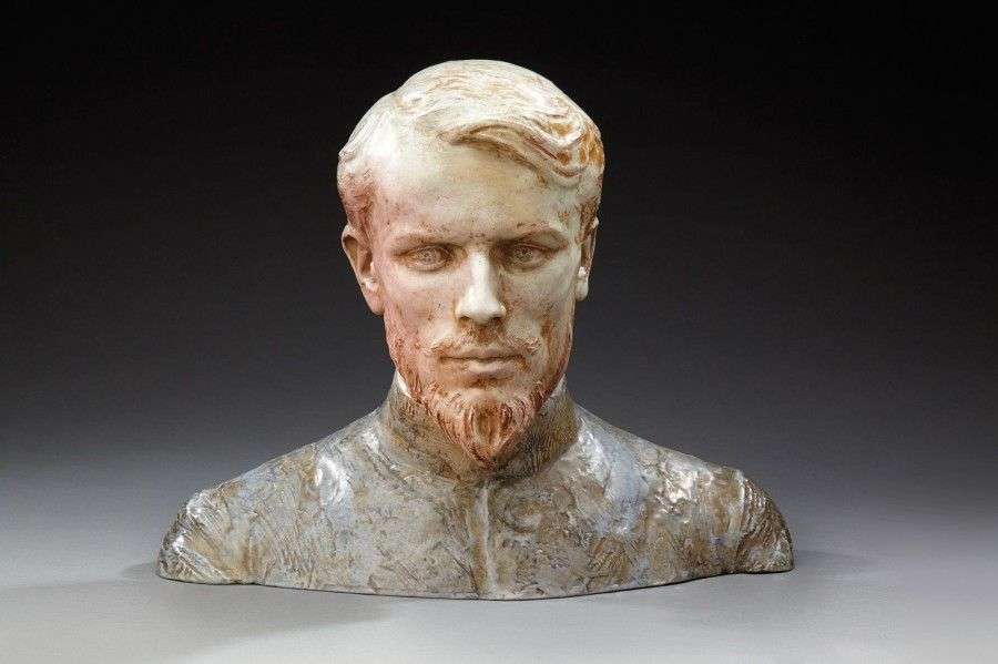 Sculpture en faïence émaillée rose, grise et bleue figurant le buste du céramiste. Signée "F.David sc", "E. Decoeur Céramiste" et datée 1900. H: 33 cm L: 41,5 cm P: 20 cm (saut d'émail à la base)