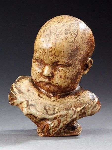 Sculpture en grès émaillé brun, beige et ocre figurant un bébé pensif. Signature incisée (partiellement lisible). Vers 1890. H: 22,5 cm (éclat à l'épaule droite et restauration à l'arrière du crane en cire)