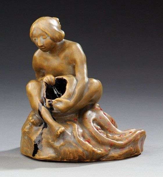 Encrier en faïence émaillée verte et rouge figurant une femme assise sur une pieuvre. Monogrammé "F.R.C.". Vers 1890. H: 16,5 cm L: 16 cm P: 14,5 cm