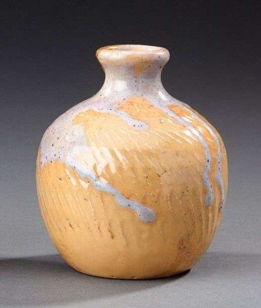 Vase piriforme en grès émaillé strié ocre à coulures bleu nuancé mauve et rehaussé d'une goutte d'or au col. Signé "Theo Perrot". Vers 1900. H: 9,5 cm