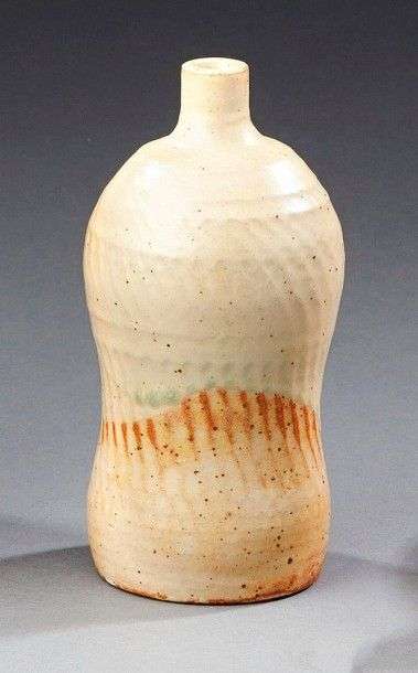 Bouteille à saké en grès émaillé beige et ocre présentant une frises de scarifications. Signée "Jean Carriès mélé 208-699". Vers 1890. H: 15 cm