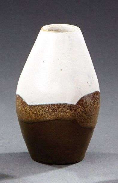 Petit vase ovoïde en grès à décor de coulures blanche et kaki jaspé nuancé chocolat. Signé "Lion". Vers 1930. H: 12 cm.