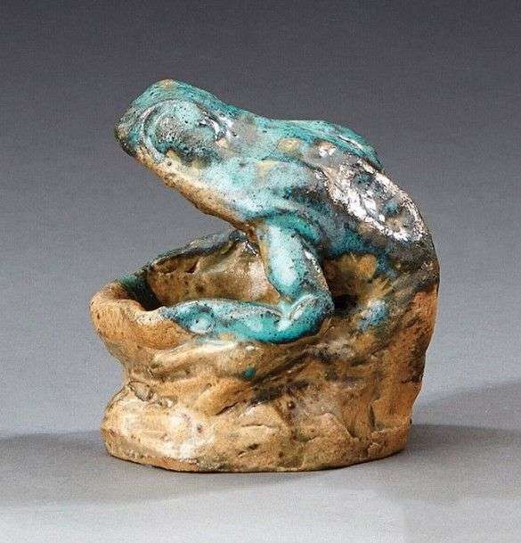 Cendrier en grès émaillé vert nuancé beige figurant une grenouille. Signé "Methey" et "Coulon". Vers 1900. H: 8,5 cm (*)
