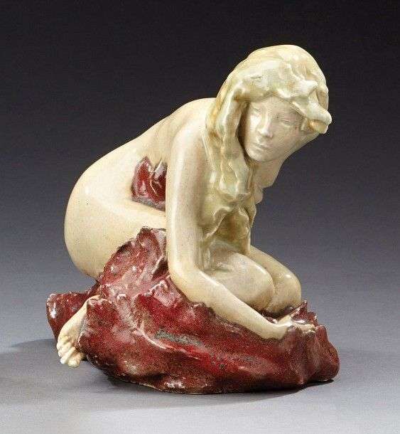 "La salamandre" Sculpture en porcelaine émaillée gris céladon et rouge sang-de-boeuf figurant une femme assise sur un parterre naturaliste. Signée "Charlotte Besnard" et monogrammée "A.D.S." Vers 1900. H: 18 cm L: 21 cm P: 15,5 cm