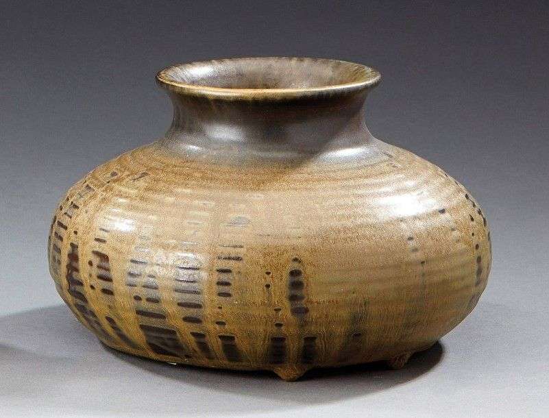 Vase à panse bombée aplatie et annelée en grès émaillé vert nuancé marron. Signé "Jeanneney". Vers 1900. H: 13 cm Diam: 20 cm (*)