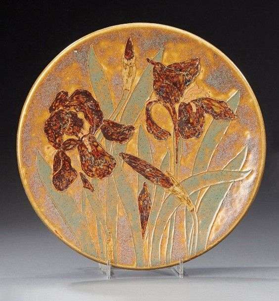 Plat en grès émaillé à motifs de fleurs d'iris. Cachet circulaire "Auguste Delaherche" et numéroté. Vers 1900. Diam: 32 cm (*)