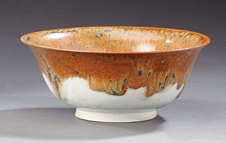 Bol en porcelaine émaillée à décor d'une coulure dans les tons ocres sur fond blanc Monogramme au trèfle "A.D" et numéroté 14. Vers 1920. Diam: 17 cm (*)