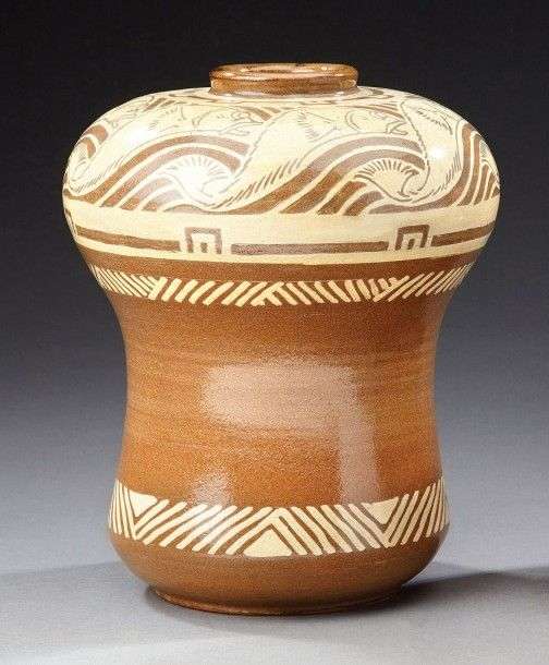 Vase bombé en grès émaillé marron et crème à décor de frises à motifs géométriques et de poissons. Monogrammé. Vers 1910. H: 23 cm (*)