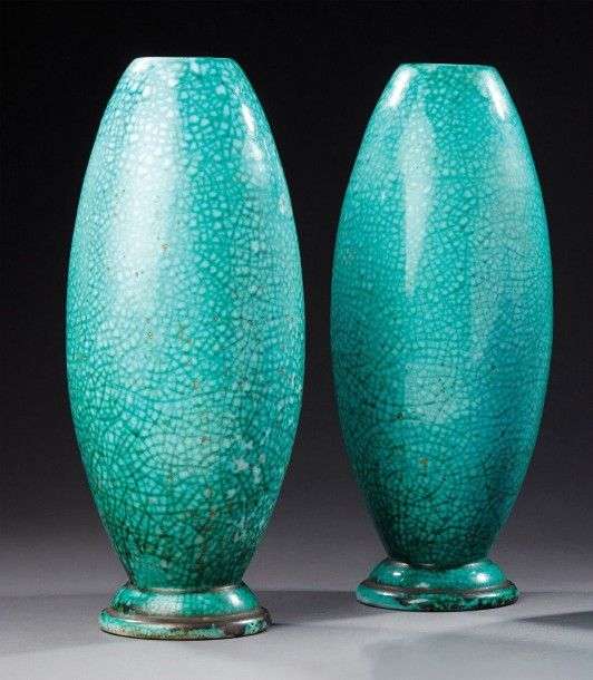 Paire de vases obus en faïence émaillée craquelée verte. Signés "Primavera made in france" et numérotés. Vers 1930. H: 39 cm