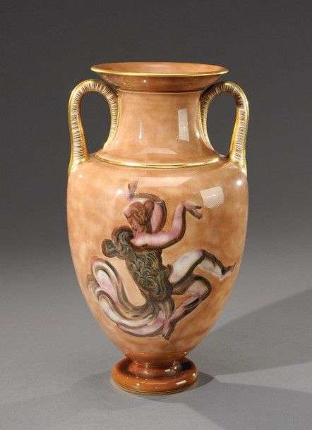 Vase balustre à anses latérales en porcelaine émaillée polychrome à décor d'une ronde de danseuses sur fond beige nuancé rehaussé de filet d'or. Signé du cachet de la manufacture nationale de Sévres et monogramme de l'artiste. Vers 1940. H: 31 cm