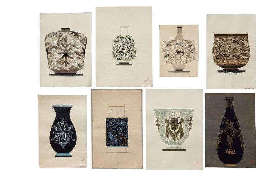 Suite de huit études préparatoires gouachées polychrome pour des vases à décor de sanglier, de cerf, de Poséidon et de divers motifs floraux. Signées "A.Leduc". Dimensions: 54 x 37 cm (légères déchirures)