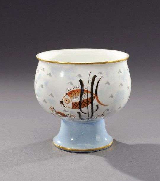 Vase tronconique sur pied en porcelaine émaillée à décor d'un poisson. Signé du cachet de la Manufacture avec la lettre date DA pour 1924 et P. LARDIN. H: 10 cm Diam: 11 cm (taches)