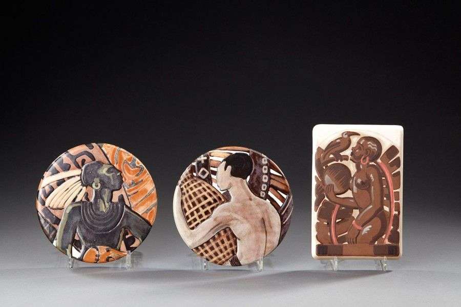 Suite de trois plaques émaillées polychromes à décor africaniste dans l'esprit de l'exposition coloniale. Une plaque signée. Vers 1930. Diam: 20 cm (fêle sur une plaque)